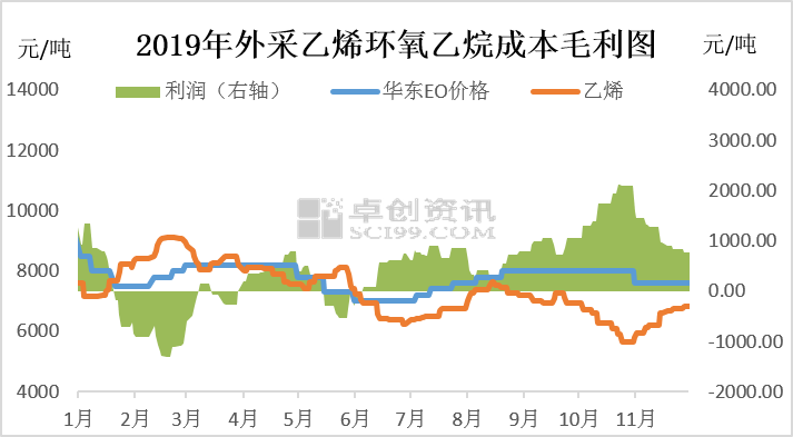 2019年環氧乙烷利潤整體維持可觀態勢,年內最高點2129元/噸,最低點-1300元/噸,平均利潤578.88元/噸,同比同期下滑45.5%。關鍵因素有幾點:首先,利潤高點的關鍵因素在于,乙烯價格波動頻繁,且在乙烯低位時間,環氧乙烷價格并未實質性下調,所以拉高環氧乙烷利潤;第二,環氧乙烷年內處于供需緊平衡,且限產、減產等政策對環氧乙烷價格起到很高的保價效果;利潤下滑的主要因素在于,乙二醇年內價格表現較差,且環氧乙烷供應面增加,導致環氧乙烷價格維持低位,在時段內拖累了環氧乙烷行情。