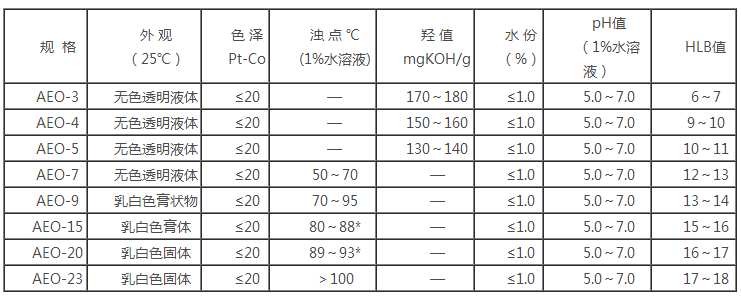 1、AEO-3、AEO-4、AEO-5易溶于油及極性溶劑中,水中呈擴散狀,具有良好的乳化性能,作w/o型乳化劑,用于礦物油、脂族溶劑的乳化,聚氯乙烯塑料溶膠的降粘劑,在化纖油劑中廣泛使用,AEO-3是生產AES的主要原料,AEO-4可作硅酮和烴類的乳化劑、干洗劑。