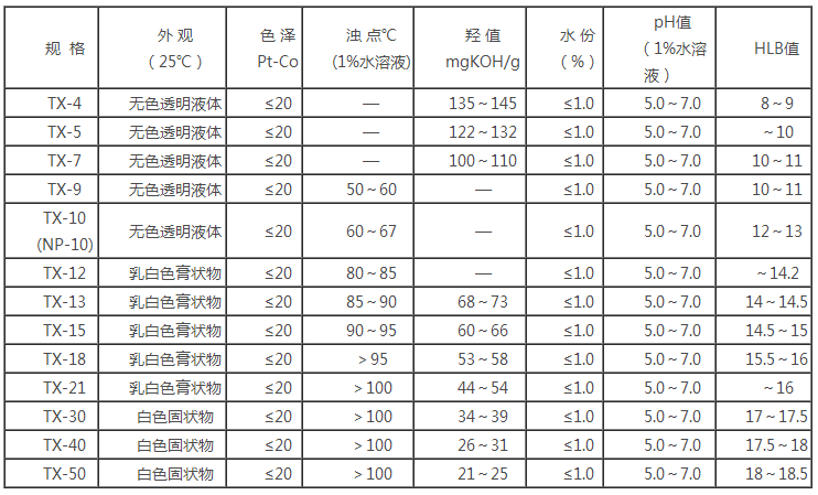 乳化劑TX-4,TX-5,TX-7,TX-9,TX-10,TX-12,TX-13,TX-15,TX-18,TX-21,TX-30,TX-40,TX-50