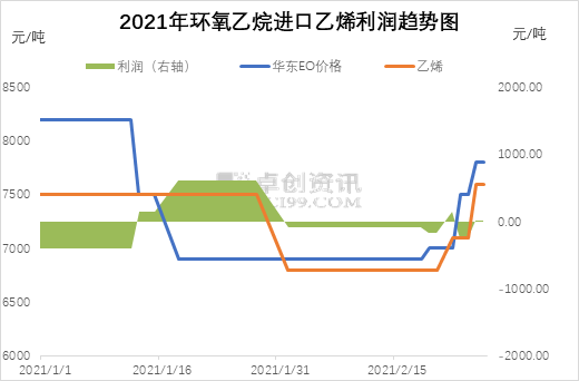 節(jié)后歸來(lái),乙烯價(jià)格呈上揚(yáng)趨勢(shì)明顯,漲幅超過(guò)10%,外采乙烯生產(chǎn)的環(huán)氧乙烷企業(yè)成本承壓明顯;乙烯按照7800元/噸測(cè)算,環(huán)氧乙烷面臨虧損邊緣;近期,乙烯下游表現(xiàn)良好,支撐乙烯基本面,趨勢(shì)穩(wěn)中向好明顯。